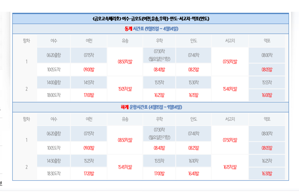 금오도로 향하는 여객선은 여수시 남면 방향으로 정기적으로 운영되고 있으며, 주요 출항지는 여수 연안여객선터미널이다.