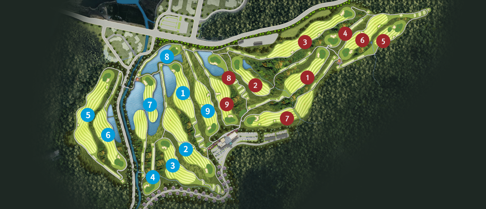 - 홍단풍 코스: 계곡 속 높은 지대에서 멀리 볼 수 있는 원경의 아름다움과 홀 사이 자연림으로 분리되어 계곡을 넘겨야 하는 설계로 난이도를 조절하였습니다.