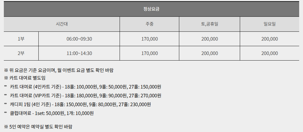 - 이용 요금: 그린피는 주중 170,000원부터 시작하며, 주말 및 공휴일 요금은 변동될 수 있으므로 홈페이지를 참조하거나 전화 문의 바랍니다.