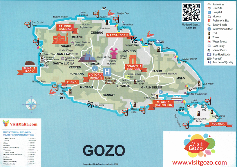 주요 명소는 섬 전역에 흩어져 있어 버스보다는 렌터카를 이용한 이동이 효율적이지만, 도보 여행자도 고조섬의 버스 루트를 지도상에서 잘 확인한다면 1~2일 일정으로 충분히 주요 명소를 둘러볼 수 있다. 특히 람라 베이(Ramla Bay), 탈리안트 해안절벽, 주가즈라 윈도우, 그리고 다이빙 명소 인랜드 씨(Inland Sea) 등이 지도상 해안선에 위치해 있으므로 동선을 짤 때 지도에서 고도차와 거리를 함께 고려하는 것이 좋다.