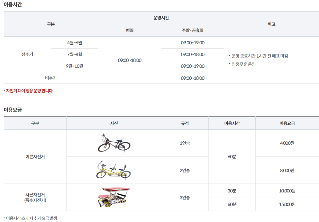 자전거 대여는 공원 내 매표소에서 가능하며, 1인용부터 3인 가족용까지 다양하게 준비되어 있다. 아이들과 함께하는 가족이라면 자전거를 타고 공원을 한 바퀴 돌아보는 것도 벚꽃 시즌만의 특별한 추억이 될 것이다. 또한 매점에서 간단한 간식과 음료를 구매할 수 있으며, 돗자리나 간편한 음식만 준비해도 누구나 즉석 피크닉이 가능하다.