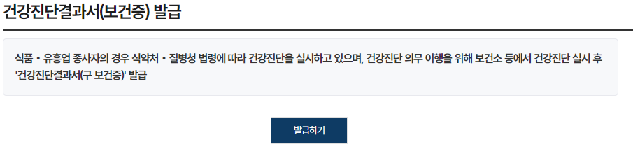 - 민원 신청 메뉴 선택: 보건증(건강진단결과서)을 검색하고 민원 신청을 통해 발급받을 수 있습니다.