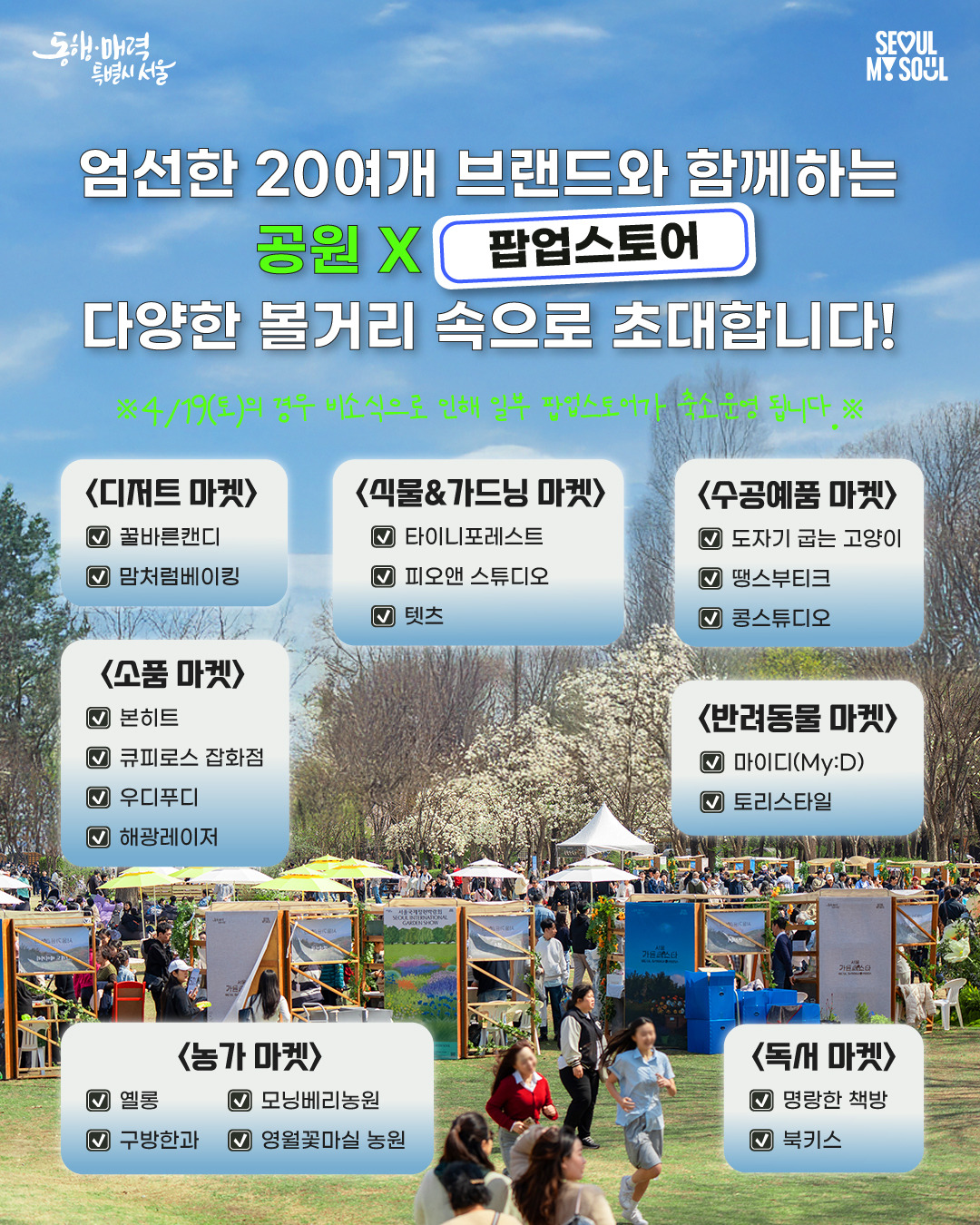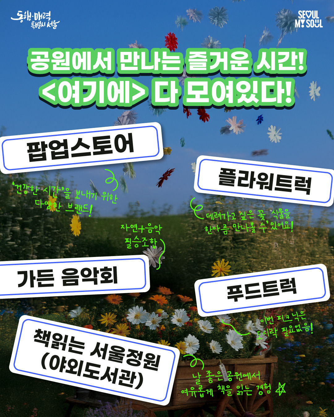 서울의 봄이 더 풍성해지는 계절, 2025년 4월. 서울시 전역의 공원들이 시민들을 위한 문화 공간으로 바뀐다. <서울가든페스타>는 4월 5일부터 5월 5일까지 한 달 동안 열리는 봄 축제로, 다양한 팝업스토어와 문화 프로그램을 통해 공원이 일상 속 활기와 여유를 함께 즐길 수 있는 공간으로 재탄생한다. 마켓, 버스킹, 책정원, 요가 클래스 등 자연과 문화를 아우르는 콘텐츠가 도심 속 공원에서 펼쳐진다.