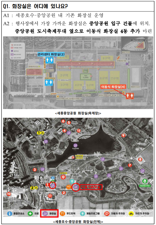 - 고정 화장실 14개소 + 이동식 화장실 4개소 운영