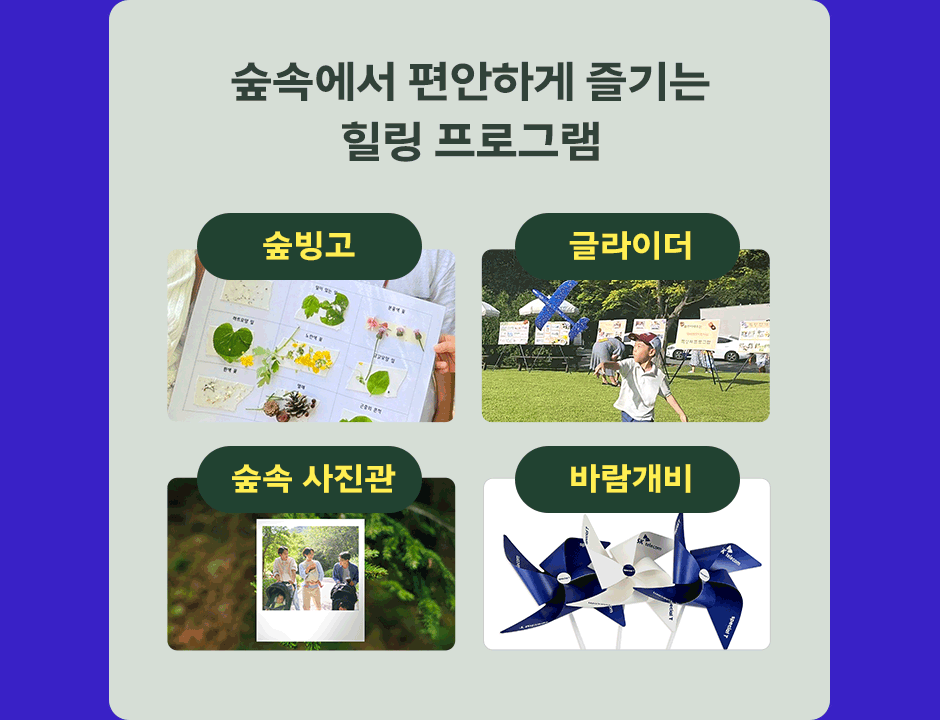 - 자연 체험 프로그램: 숲과 자연을 가까이에서 체험하는 다양한 활동