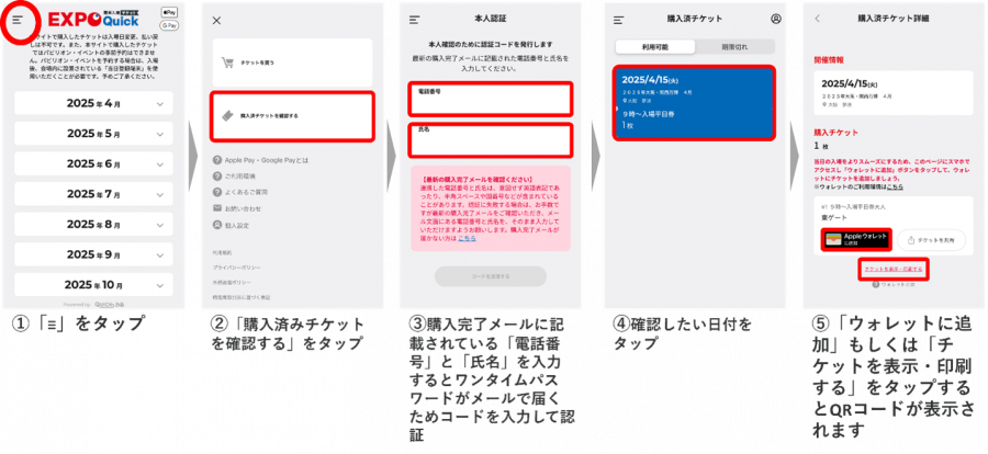 구입한 티켓은 QR코드를 스마트폰 지갑에 저장하거나 인쇄해서 지참할 수 있으며, 구입 확인 시 입력한 전화번호와 성명이 시스템에서 영문 또는 특수문자 처리되는 경우가 있으므로, 구입 확인 메일을 복사해 입력하는 것을 추천한다. 이처럼 EXPO Quick은 오사카 엑스포를 보다 부담 없이 즐기기 위한 디지털 관람 방식으로 많은 주목을 받고 있다.