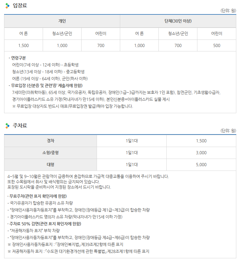 입장료 또한 매우 합리적이다. 어른 기준 1,500원, 청소년 및 군인은 1,000원, 어린이는 700원이며, 단체로 방문 시 더 저렴한 요금이 적용된다. 무료입장 대상자도 별도로 있으며, 해당자는 반드시 증빙서류를 지참해야 한다. 무엇보다 전철역에서 가까운 접근성과 저렴한 입장료 덕분에 누구나 부담 없이 다녀올 수 있는 근교 힐링 명소로 손꼽힌다.