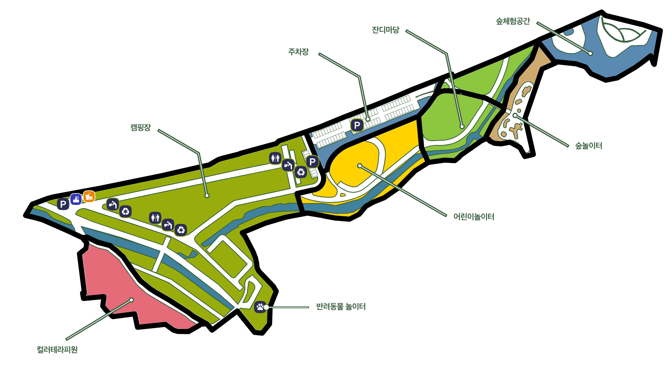 캠핑장 내에는 샤워실, 화장실, 매점, 음수대, 분리수거장, 관리사무소가 효율적으로 배치되어 있어 장기 체류에도 불편함이 없습니다. 매점에서는 간단한 간식과 캠핑용품을 구입할 수 있으며, 취수장과 분리수거장은 위생적으로 관리됩니다.