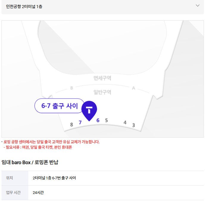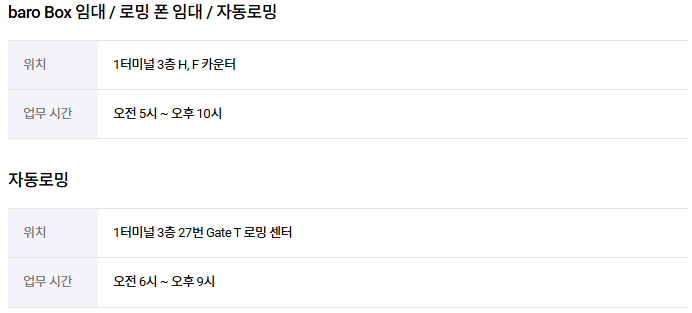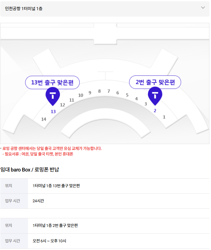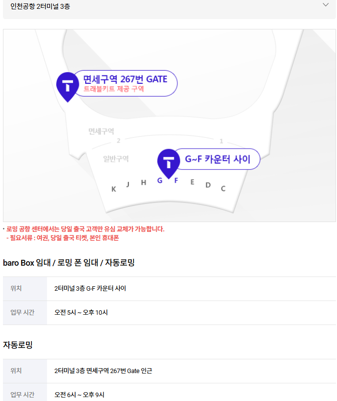제2터미널은 출국장 3층과 1층에 각각 로밍센터가 위치해 있습니다. 입국 후 유심 반납이나 서비스 해제도 빠르게 처리할 수 있어 매우 유용합니다.