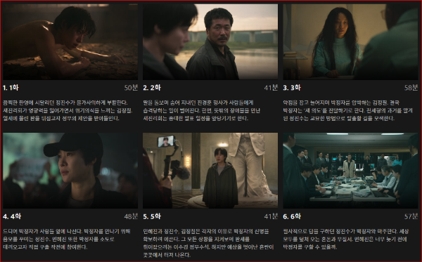 총 6부작으로 러닝타임은 60분이내 이며, 6부작 모두 10월 25일에 공개하였습니다.