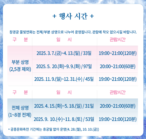 창경궁 물빛연화는 사전 예약제로 운영되며, 관람 시간은 주로 일몰 이후부터 약 2~3시간 동안이다. 평일과 주말 모두 운영되지만, 금요일과 주말은 예약 경쟁이 치열하므로 조기 예약이 필수다. 또한 궁 내부 조명이 낮기 때문에, 이동 시 안전을 위해 낮은 밝기의 손전등이나 휴대폰 라이트를 준비하는 것이 좋다. 삼각대나 대형 카메라 장비는 반입이 제한될 수 있으며, 삼각대를 사용할 경우 미리 안내 직원의 허락을 받는 것이 좋다.