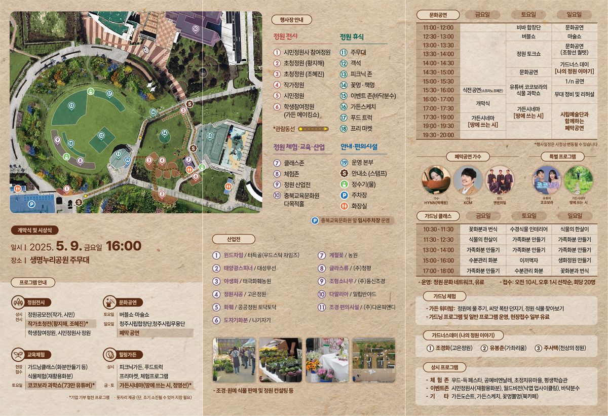 특히 5월 9일 금요일에는 작가식재팀 ‘땅에 쓰는 시’와 함께하는 정원 산책 프로그램이 열리며, 관람객이 직접 자연의 감성을 글로 표현해보는 소소한 체험도 가능합니다.
