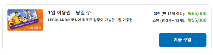 2025년 기준 춘천 레고랜드 입장료는 다음과 같습니다. 성인 기준 65,000원, 소인(만2세~12세)은 55,000원이며, 만2세 미만은 무료 입장이 가능합니다.
