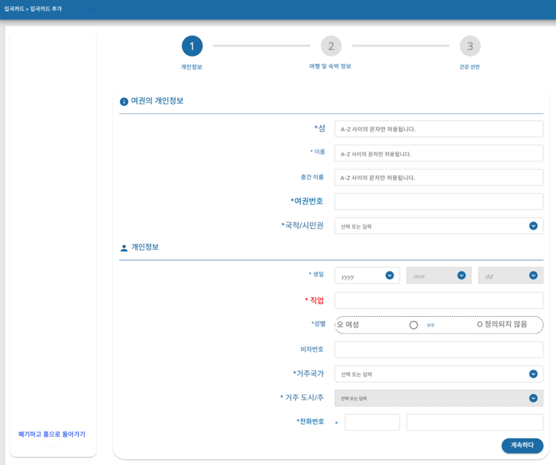 사이트 접속 후 화면 오른쪽 상단에서 ‘한국어’를 선택하면 한국어 안내가 제공된다. 이후 여권 정보, 이름, 생년월일, 직업, 연락처(휴대폰번호는 +82로 시작, '0' 제외) 등 개인정보를 영문으로 기입한다.