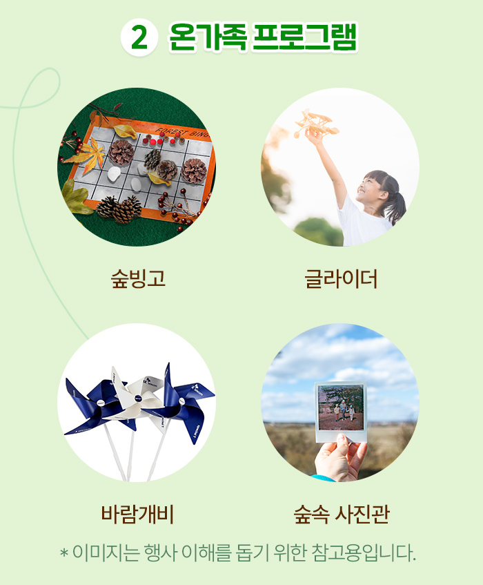 포레스트 캠프는 연령대별 맞춤형 프로그램을 운영해 모든 방문자가 만족할 수 있도록 구성되어 있습니다. 어린이들을 위한 프로그램으로는 숲속에서 자연물을 찾아 완성하는 '숲빙고', 직접 만드는 글라이더 날리기, 바람개비 체험, 즉석 사진 인화 등이 있습니다. 단순한 놀이나 만들기를 넘어, 아이들이 자연과 교감하며 창의력과 감수성을 함께 키울 수 있는 구성입니다.