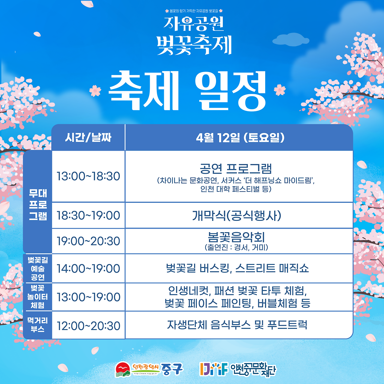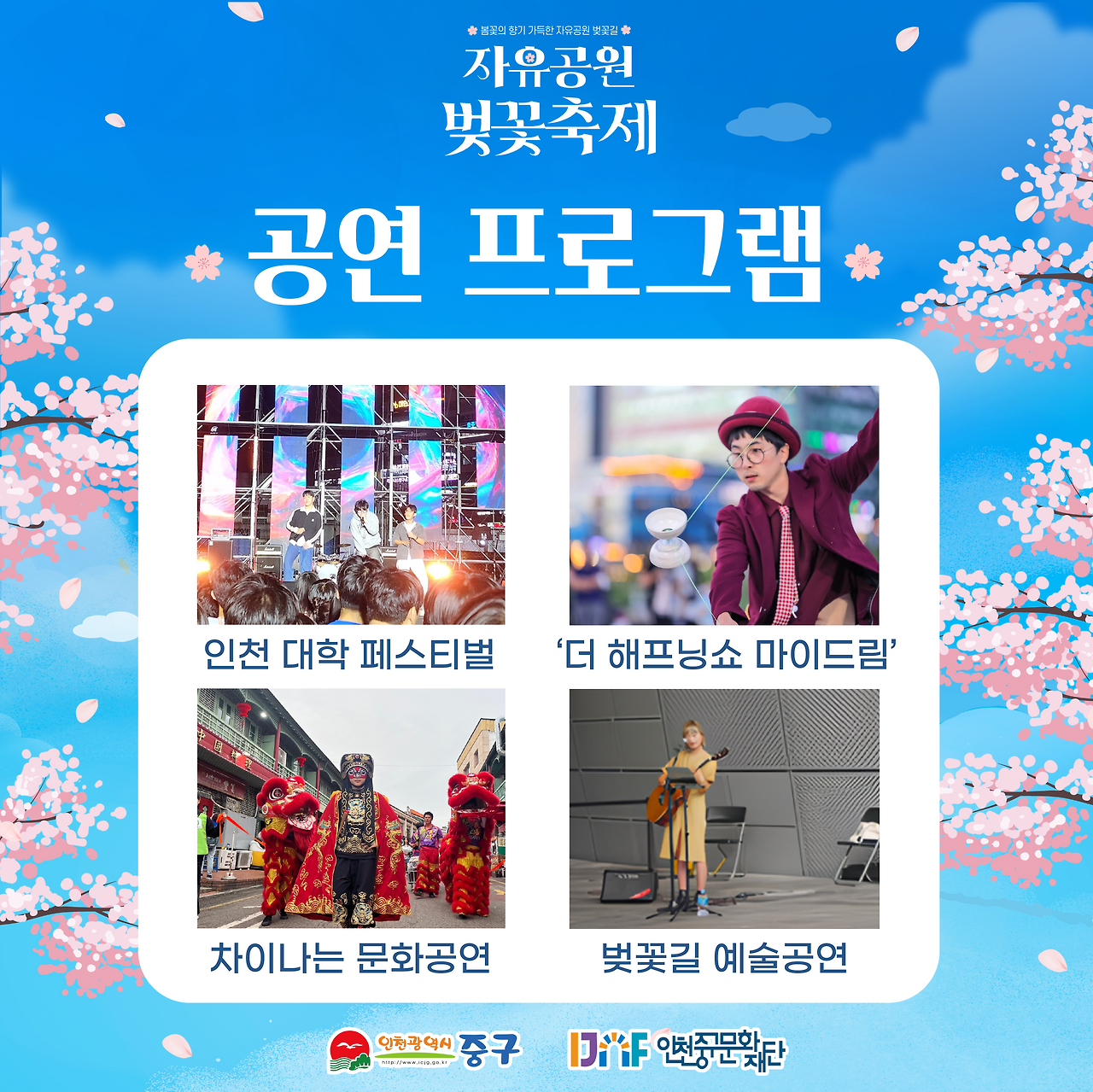 올해 벚꽃축제는 4월 5일 하루 동안 열리며, 인천중구문화재단이 주관하고 중구청이 주최한다. 오후 1시부터 시작되는 프로그램은 클래식 앙상블, 마술 쇼, ‘인생네컷’ 포토 부스, 페이스 페인팅 체험으로 이어지다가 밤 7시가 되면 가수 거미와 박명수, 경서가 무대를 달궈 축제의 절정을 맞는다. 모든 행사는 무료로 진행되며, 안전 통제 인력과 이동식 화장실이 대폭 확충돼 가족 단위 방문객도 편안하게 즐길 수 있다.