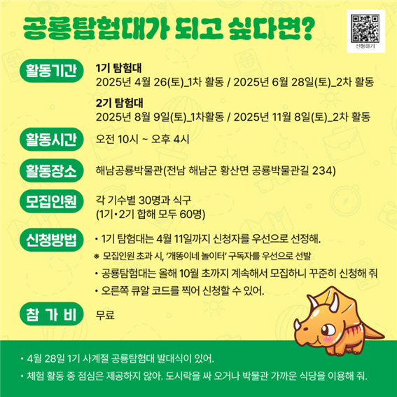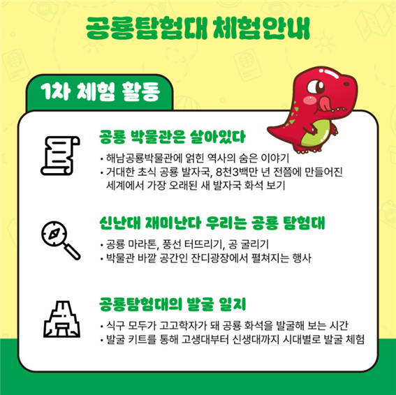 ‘공룡탐험대’는 단순한 박물관 견학을 넘어, 아이들이 직접 참여하고 느끼며 배울 수 있도록 구성된 체험형 프로그램입니다. 해남공룡박물관을 중심으로 진행되는 이 행사는 1기와 2기로 나뉘어 각각 두 차례의 활동을 진행해요.