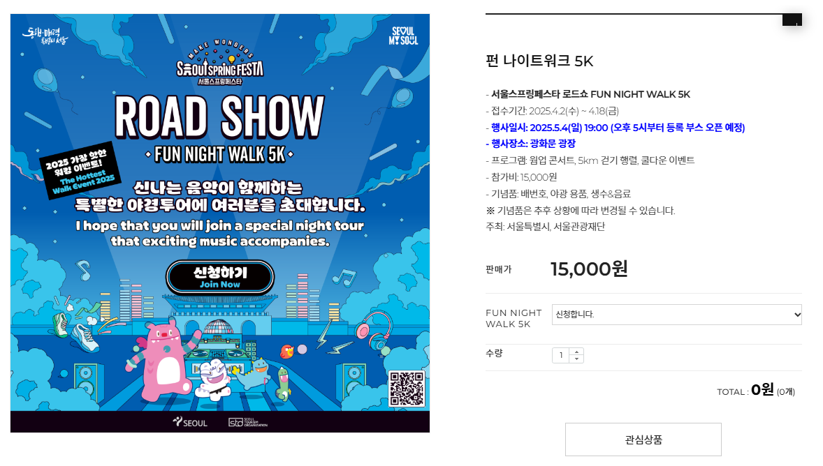 - 행사명: 서울스프링페스타 로드쇼 – FUN NIGHT WALK 5K