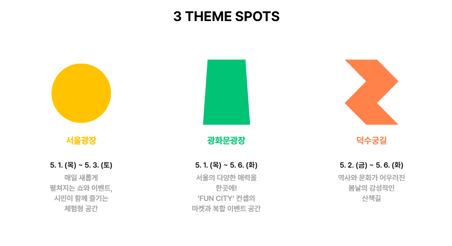 서울스프링페스타는 세 가지 주제 공간인 테마스팟(THEME SPOT)을 통해 축제의 정체성을 더욱 풍성하게 전달합니다.