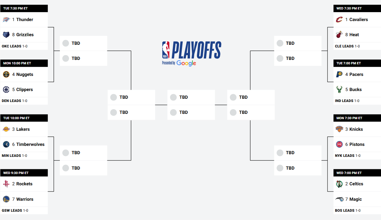 플레이오프의 특징은 단순히 성적이 아닌 ‘선수 조합의 밸런스’와 ‘상대 전술 대응력’이 결과를 가를 가능성이 높다는 점입니다. 2025년 NBA 플레이오프가 4월 19일에 개막하여 열띤 경합이 펼쳐지고 있습니다. 현재 1라운드가 진행 중이며, 각 시리즈는 7전 4선승제로 진행됩니다. 플레이오프 대진표는 아래와 같습니다.