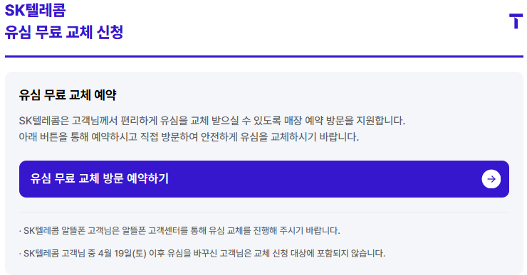 이번 SK텔레콤의 유심 교체 지원은 2025년 4월 18일(금) 기준, SKT 서비스를 이용 중이던 고객이라면 누구나 신청할 수 있으며, skt 유심 무상교체 예약 대상에 포함되어 한 번은 무료로 교체할 수 있습니다.